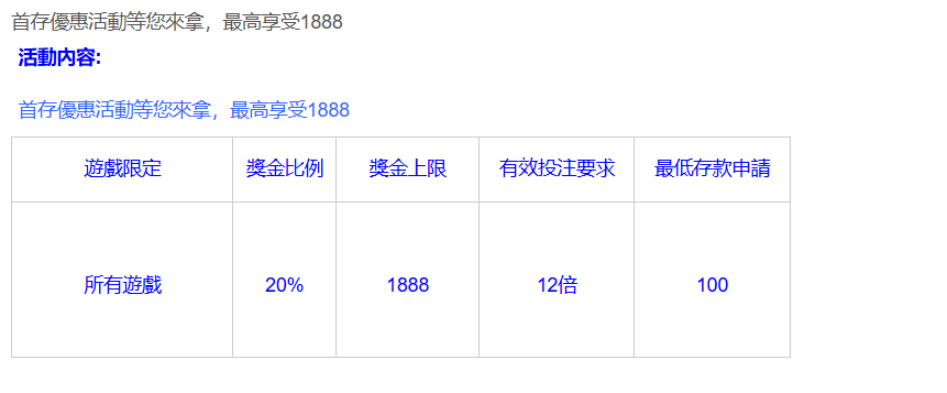 會員存款1000元,可活動20%優惠,賬戶內將有1200籌碼。