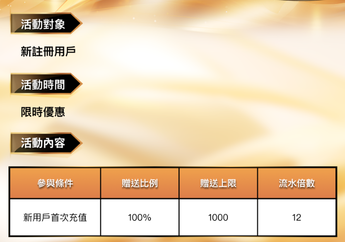1. 活動期間,新註冊用戶首次充值即可參與,彩金僅需完成「本金+彩金」12倍流水即可提領!!