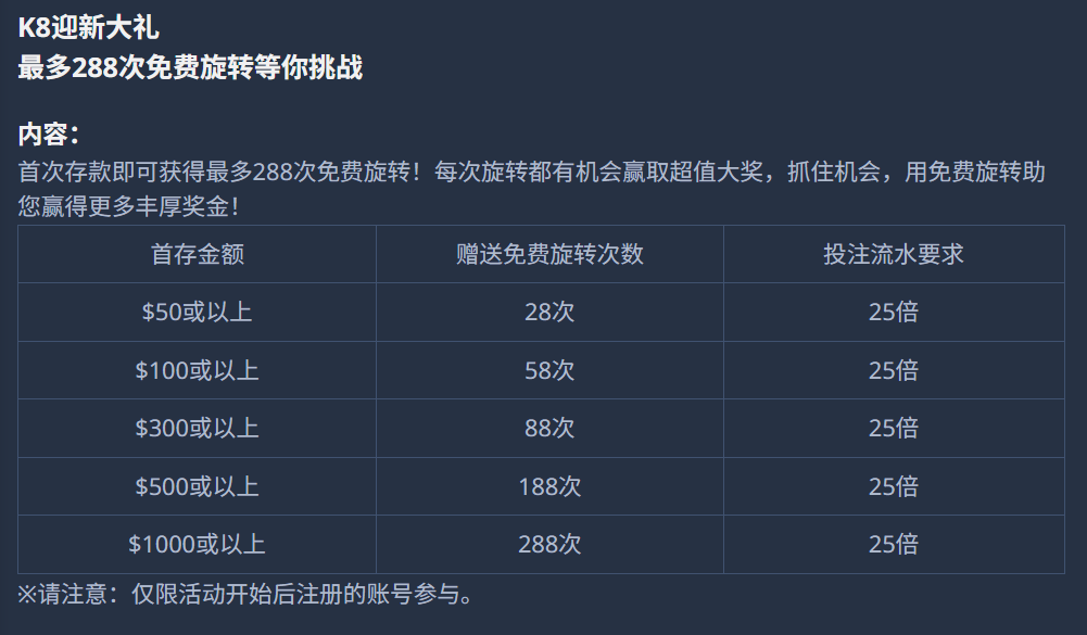 1.免费旋转仅适用于指定游戏,每次旋转价值0.2美元。需完成首次存款并达到指定金额才能领取免费旋转奖励。